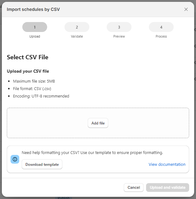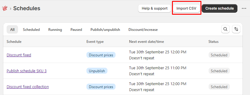 The CSV import feature allows you to create multiple schedules in bulk by uploading a properly formatted CSV file. This guide explains how to format your CSV file and use each column effectively.