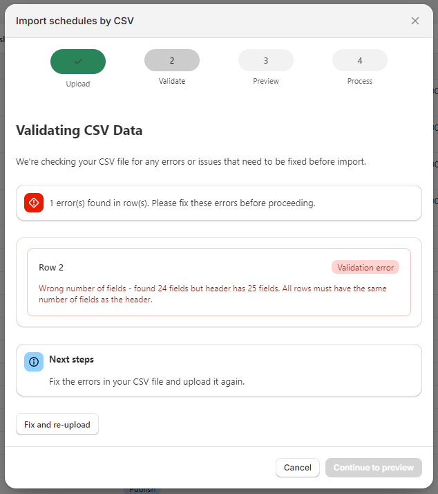 Update your CSV file to fix the errors and then click Fix and re-upload to re-upload your file.