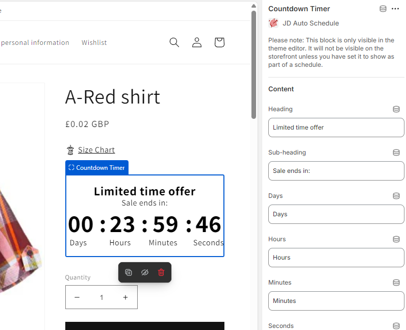 Please note: the default countdown of 24 hour only shows in the theme editor - it's just so you can see it and make any necessary modifications. On your store frontend the timer will always countdown to the end date for any product where you select the "show countdown timer" option.